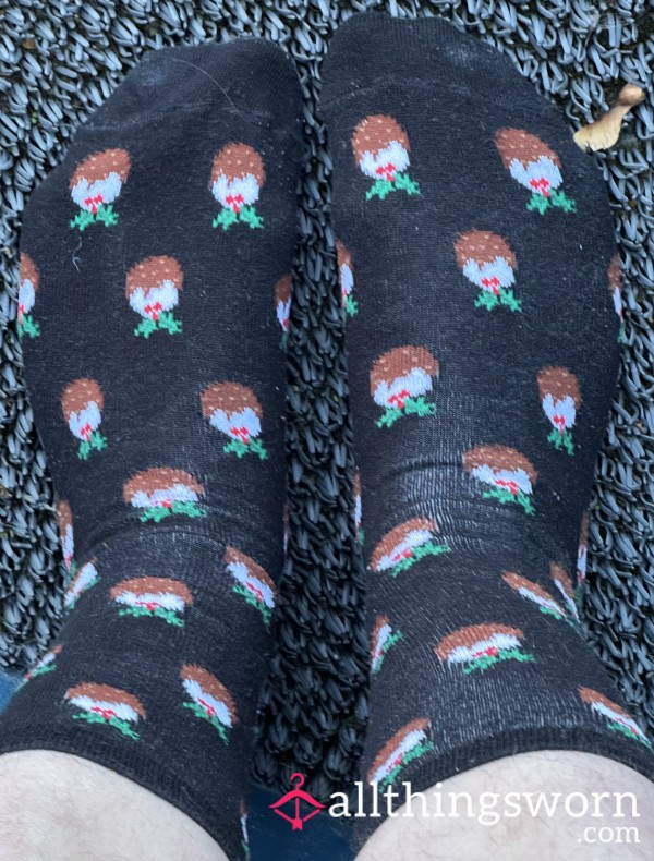 Very old and well worn, Hanes socks, black with gray soles. Sweaty from gym workout and errands. ...