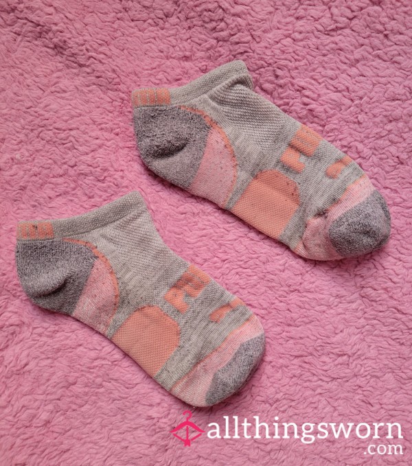 Old white Hanes gym socks. Very stained from repeated wears but will be worn again upon purchase.