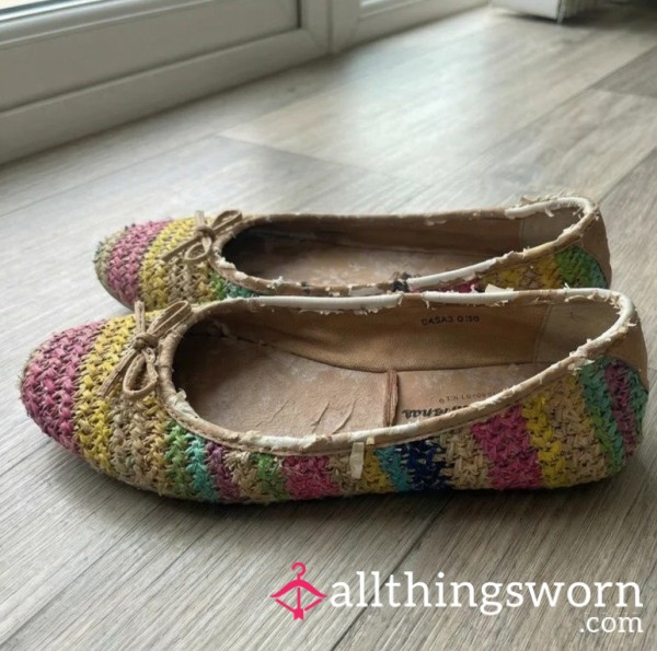 These rainbow striped woven flats by Ballerinas at Atmosphere, size 6/39. Raffia weave in pink, green, yellow, blue and natural with a little bow on the toe. Summer flats that got put through hell.