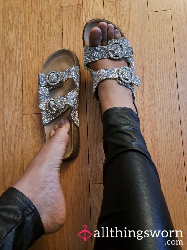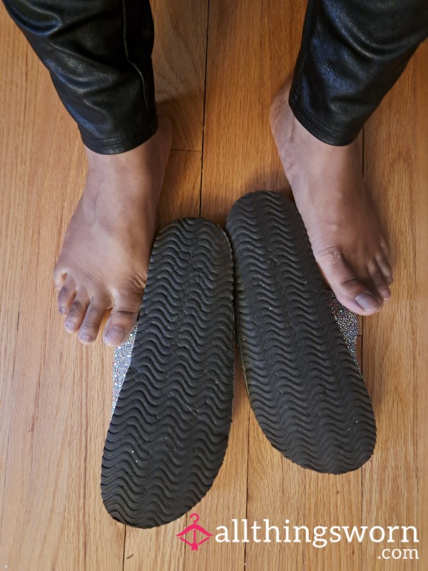 Still pretty new, but they already have a beautiful foot print forming inside... I wonder what another summer will do to them! Glittering with pretty white rhinestones, these make Me feel like a comfortable Queen lol. Wouldn't you love to be My loyal foot servant? US shipping is included, and custom video is available. I love crush videos!