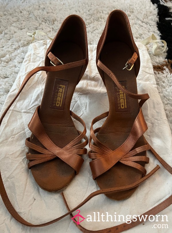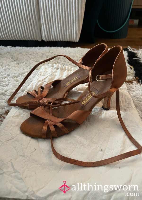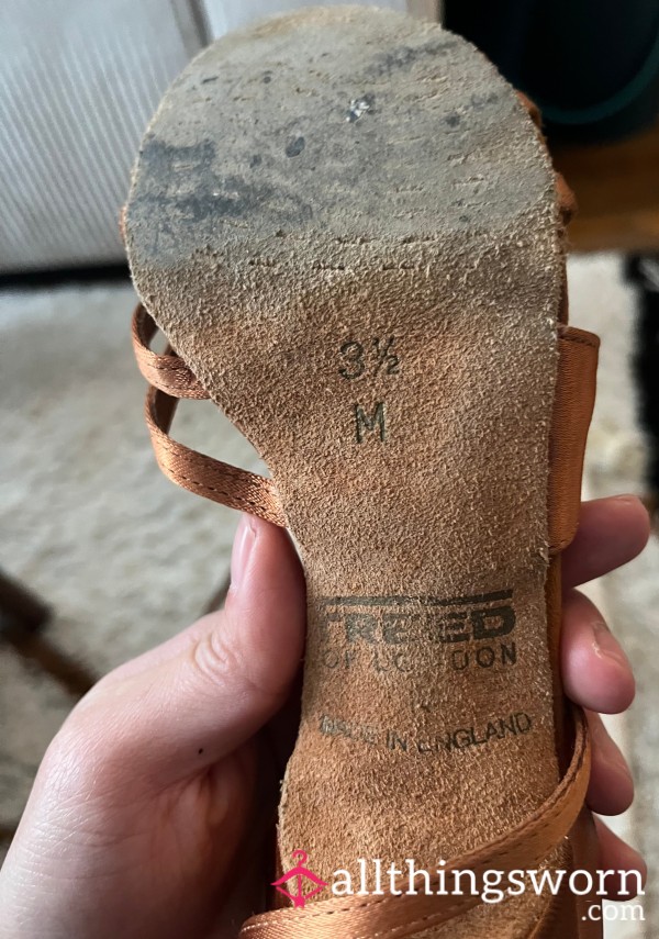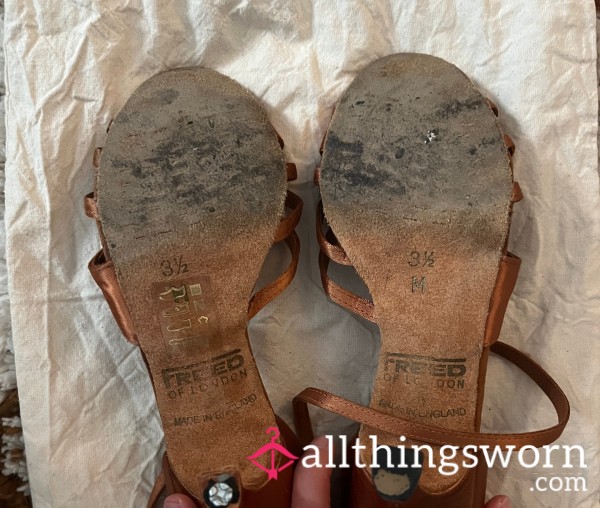 From my dancing years....professional ballroom dance heels that have felt the heat, still beautiful but needs love 😔 Satin and Suede in a copper brown tone...you can see the toe prints 👣 ----- De mes années de danse... des chaussures de danse de salon professionnelles qui ont connu la chaleur 😔 En satin et daim dans un ton brun cuivré... on peut voir les empreintes des orteils 👣