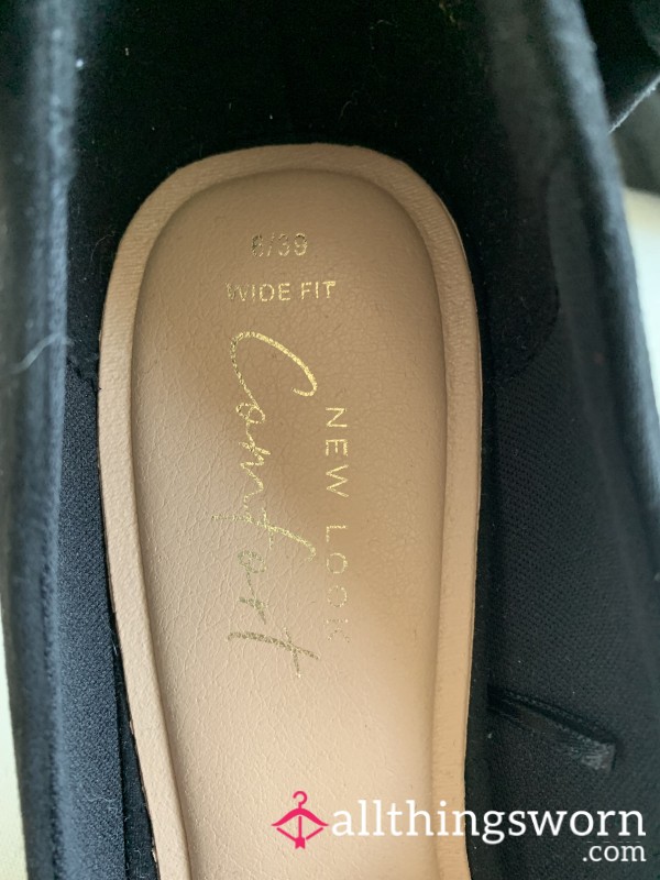 Black plateau high heels, 5 inch heel, fake leather. I used to wear them in the swinger club....