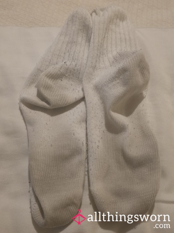 These soft, fuzzy white and blue ankle socks are available for custom wear! Pricing includes 3 days wear...
