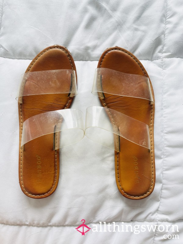Grey flat sandals worn for 2 summers, worn on a few beaches. Well worn in, kept my feet...