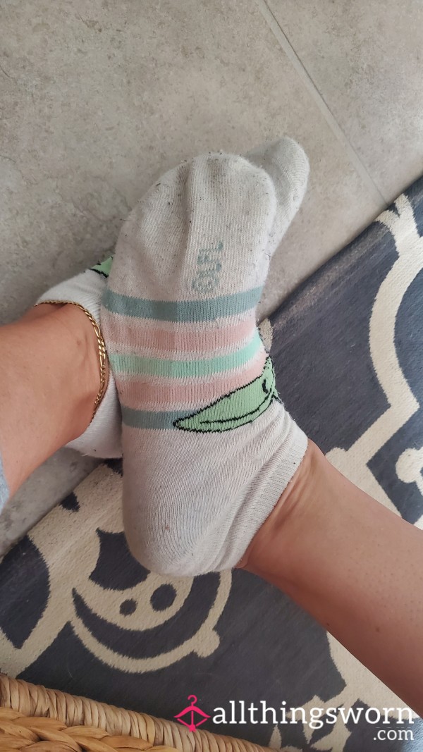 Well worn pink fluffy bed socks my size 7 feet have made these very worn in...