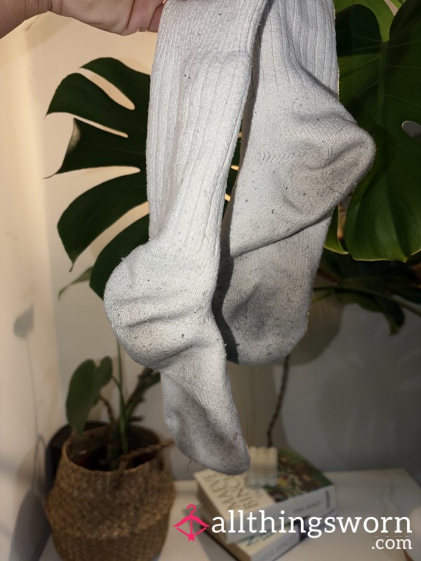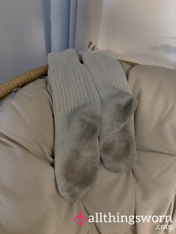 These thick white socks spent the entire day wrapped around my feet, soaking up warmth and movement, and they’re being sent exactly as they finished. Soft, sweaty, visibly dirty, and full of that unmistakable worn-in appeal sock lovers crave.