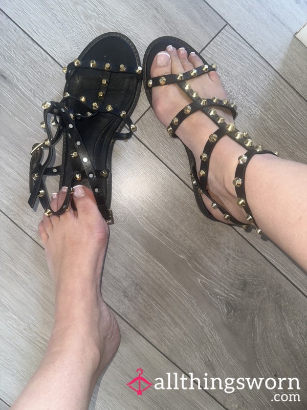 Heavily worn, pointy, shiny, flat, black, office shoes with a s**y strap, smell incredible...