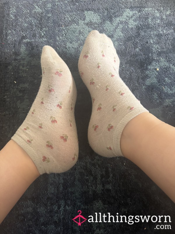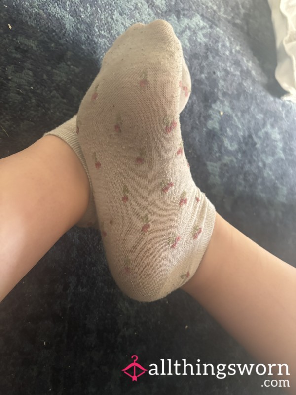 Frilly white and pink socks with red flowers (Size 7) 🥵. Price includes 2 full days of wear...