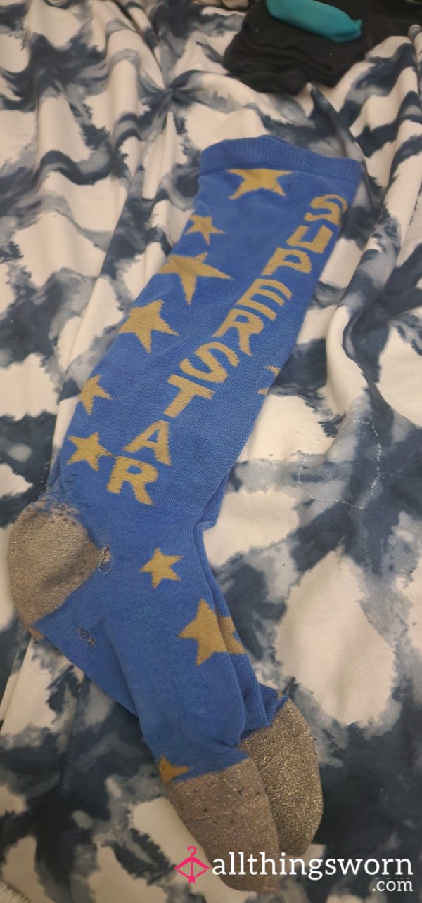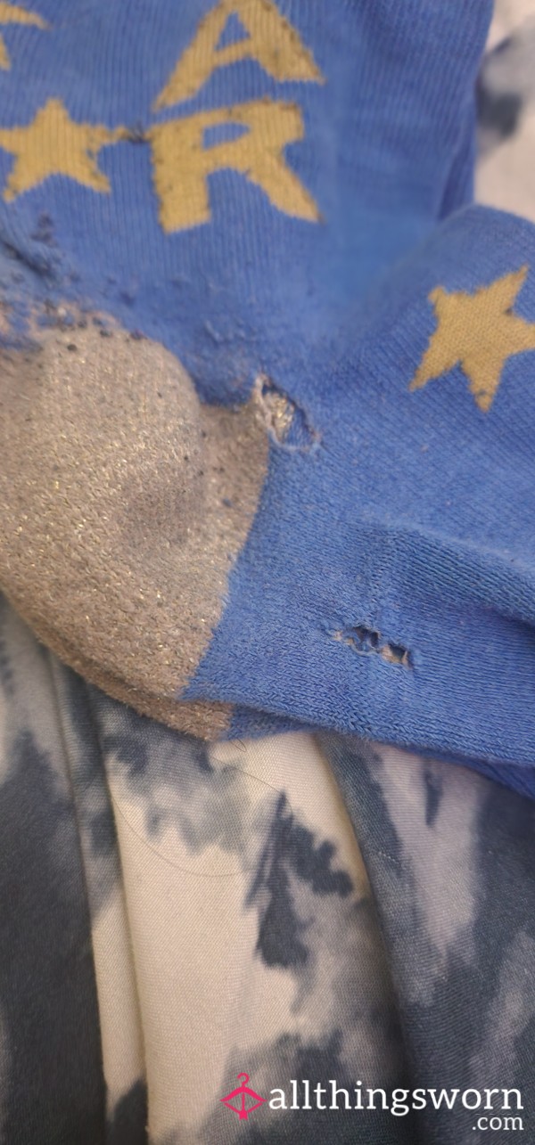 Very well worn socks. Owned for over ten years! Been worn walking the streets of New York and Dallas. Have been worn during long shifts as a bartender and barista. Currently clean, but can be worn for 24 hours!