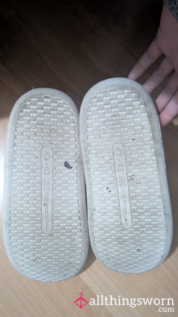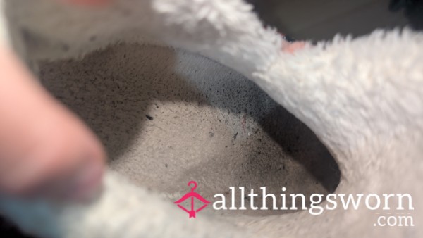 White, grungy, VERY well-worn slippers. Worn during multiple extended sock wears (owned over a year). Cornchip scent with...