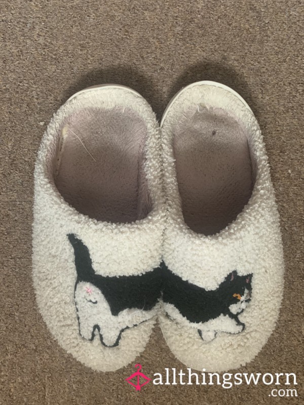 Black fuzzy house slippers, used daily with socks and bare feet....