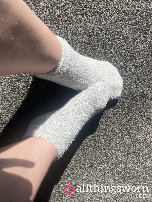 Soft, fluffy socks—worn all night, absorbing every moment of warmth and sweat as I slept. Perfectly infused with my scent, just waiting for the right owner to inhale and indulge.