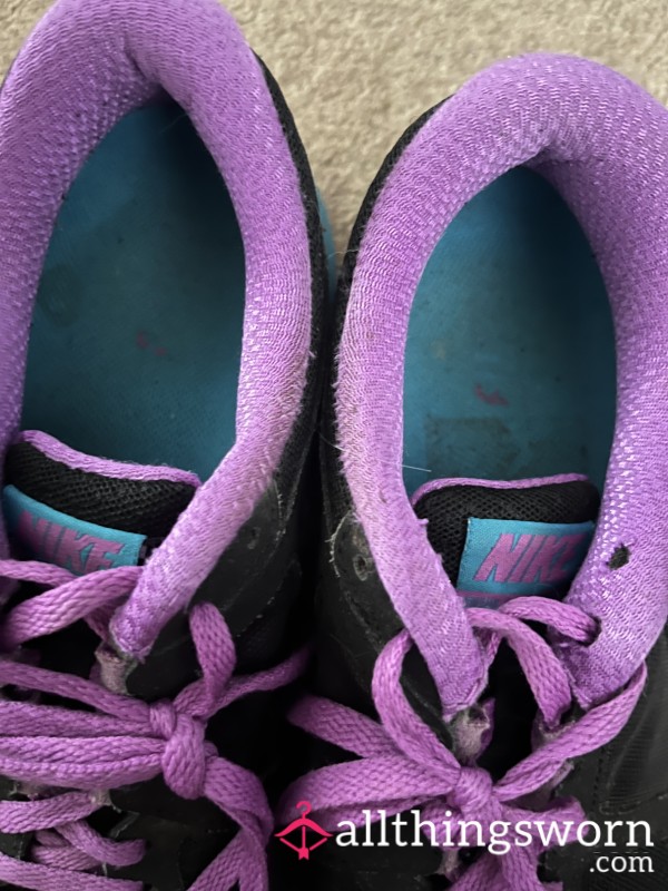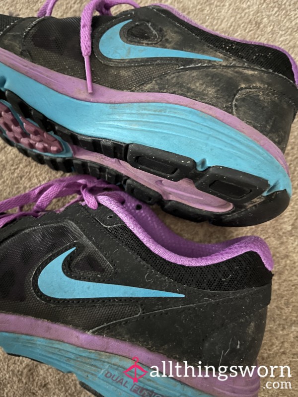 These are a pair of black Converse that have absolutely been through it. The canvas is hanging on...
