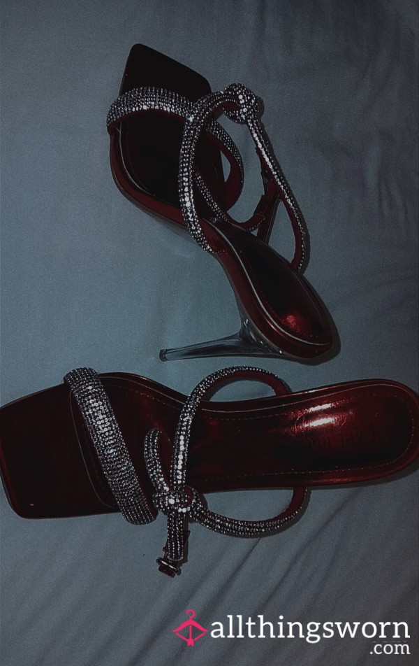 Where seduction meets sophistication. These deep scarlet heels shimmer under every light, wrapped in rows of rhinestones that kiss your ankles and glimmer like forbidden promises. The mirrored stiletto heel catches eyes and hearts alike — each step a soft click that commands attention.