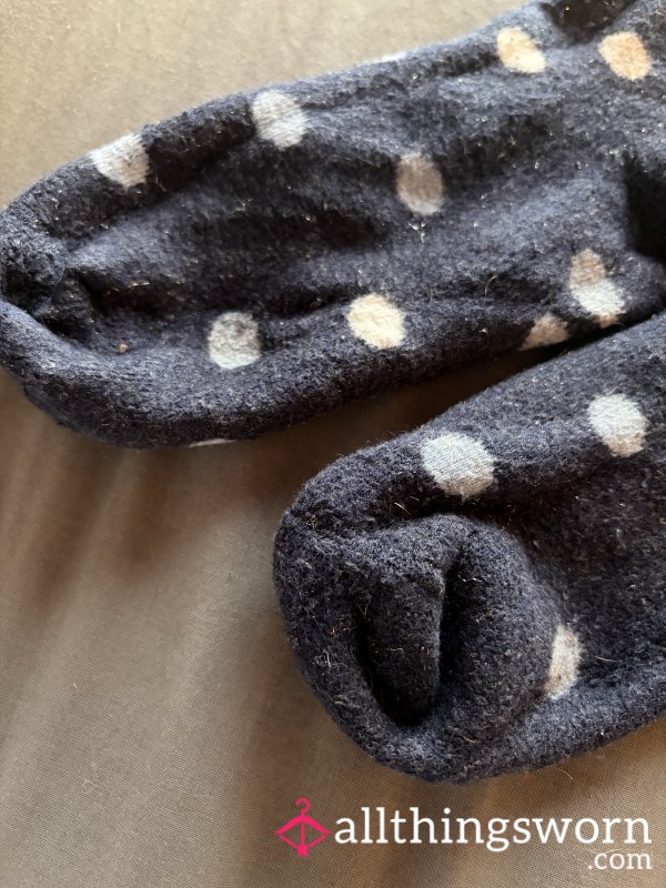 Thick and fluffy blue spotty polka dot socks. Can wear for 24 hours and get them disgusting, smelly and dirty for you