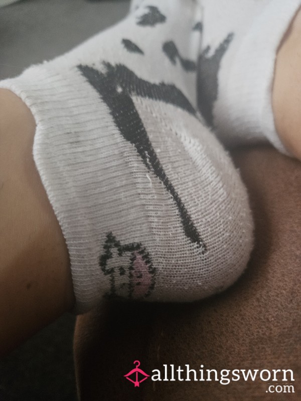 Cow print trainer socks. Worn for a full 24 hours, all day and all night in my bed.