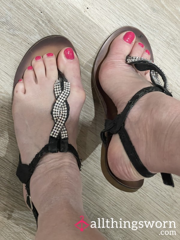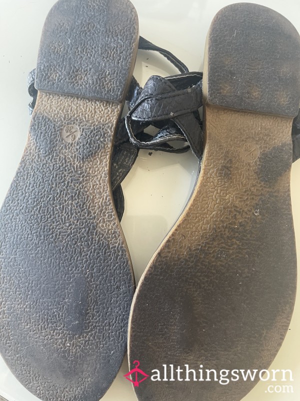 Grey flat sandals worn for 2 summers, worn on a few beaches. Well worn in, kept my feet...