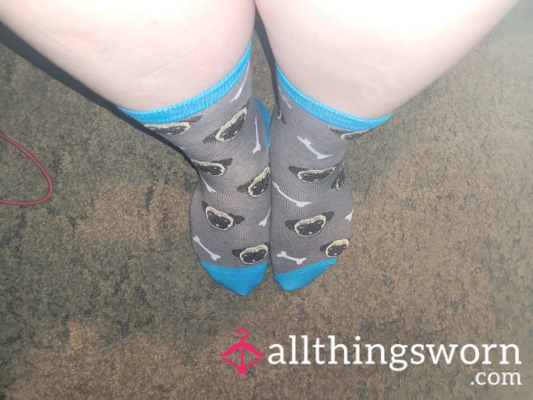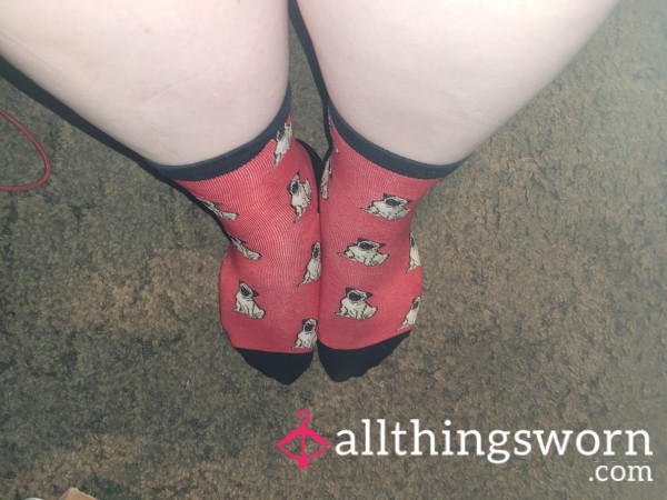 Socks that I have been wearing for the last 24 hours. And of course they have cute little pugs all over them. Willing to wear them longer if you wanna add on days at $5 a day. Just pick the color you like.
