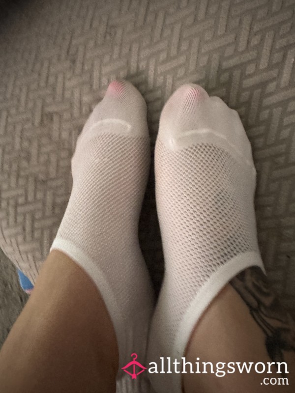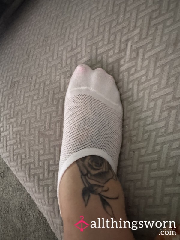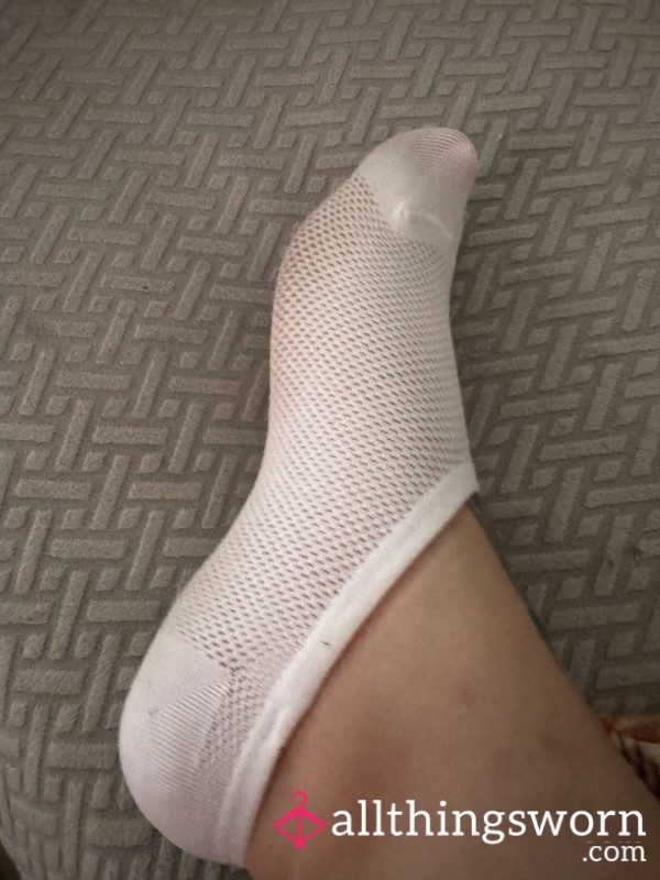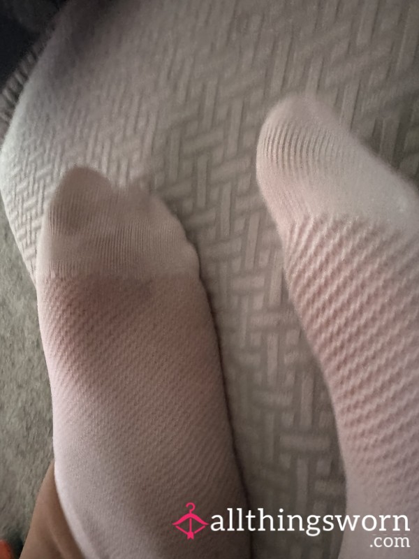 Sweaty white gym socks worn through my workouts, clinging to every drop of heat and scent. Soft, used,...