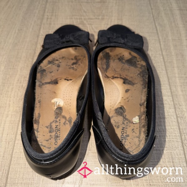 Extremely worn in and sweat filled working flat shoes.