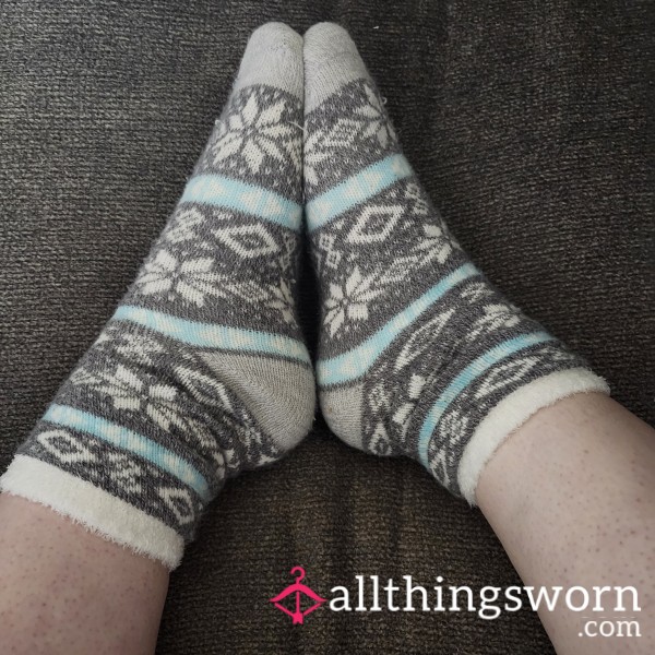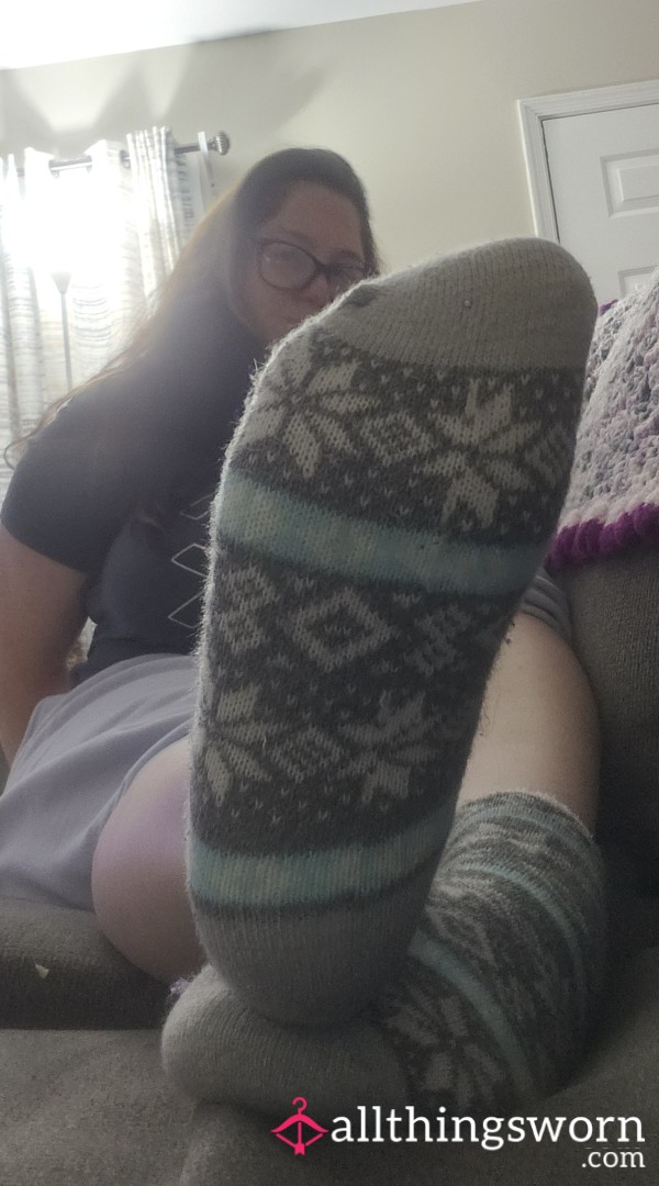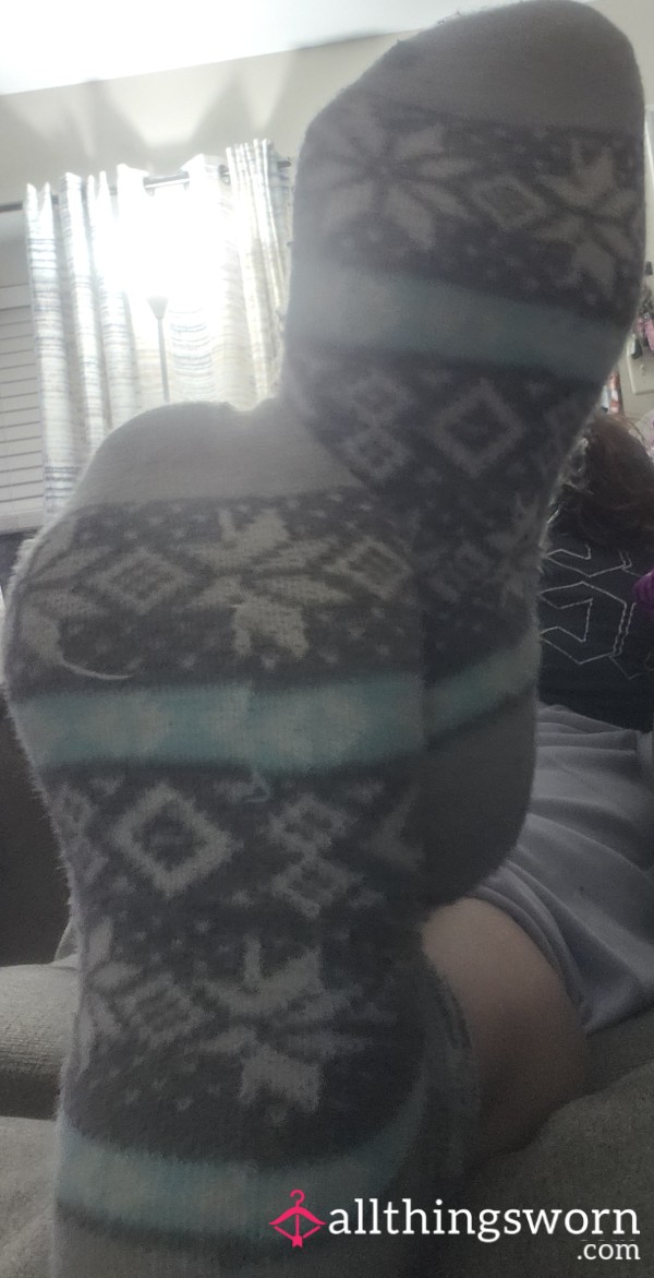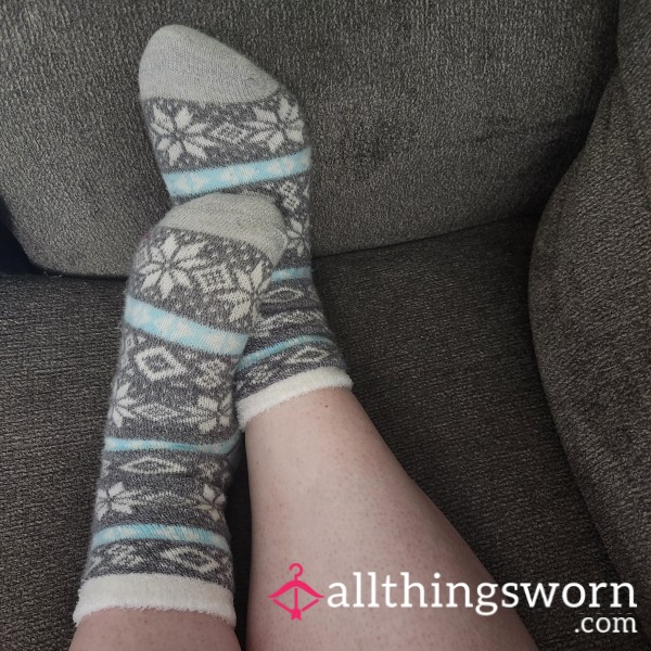 Merry Christmas!! These soft fluffy socks are up for grab! Worn all day making my s**y feet toasty as I finished my last minute Christmas shopping. Keeping me cozy and causing sweet foot sweat as I walked around in my shoes all day. These comfortable fuzzy socks will stay on throughout the night as I sleep since they continue to warm all my toes and soles. Price is negotiable just send me a message 😘