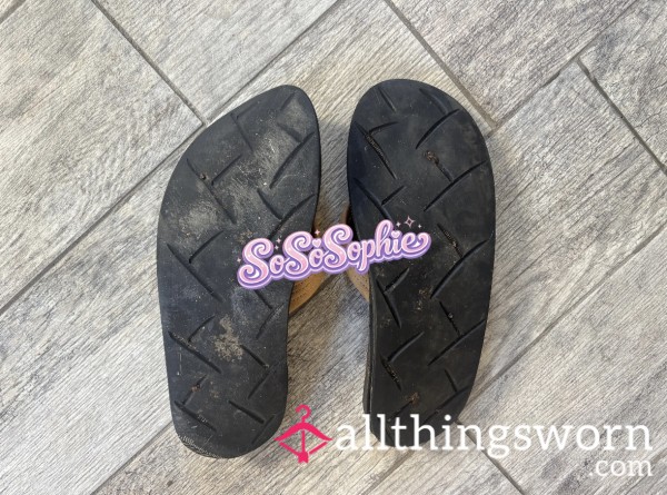 Well-loved flip flops from a Hawaii trip. I wear them to walk my dog at the beach here...