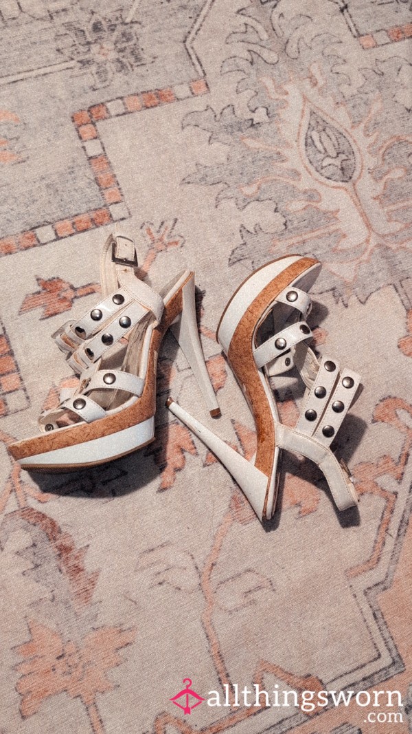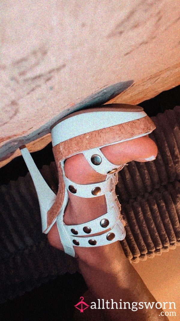 Trashed white stilettos. Very worn, dirty soles and heel tip missing. Custom clips can be added on for...