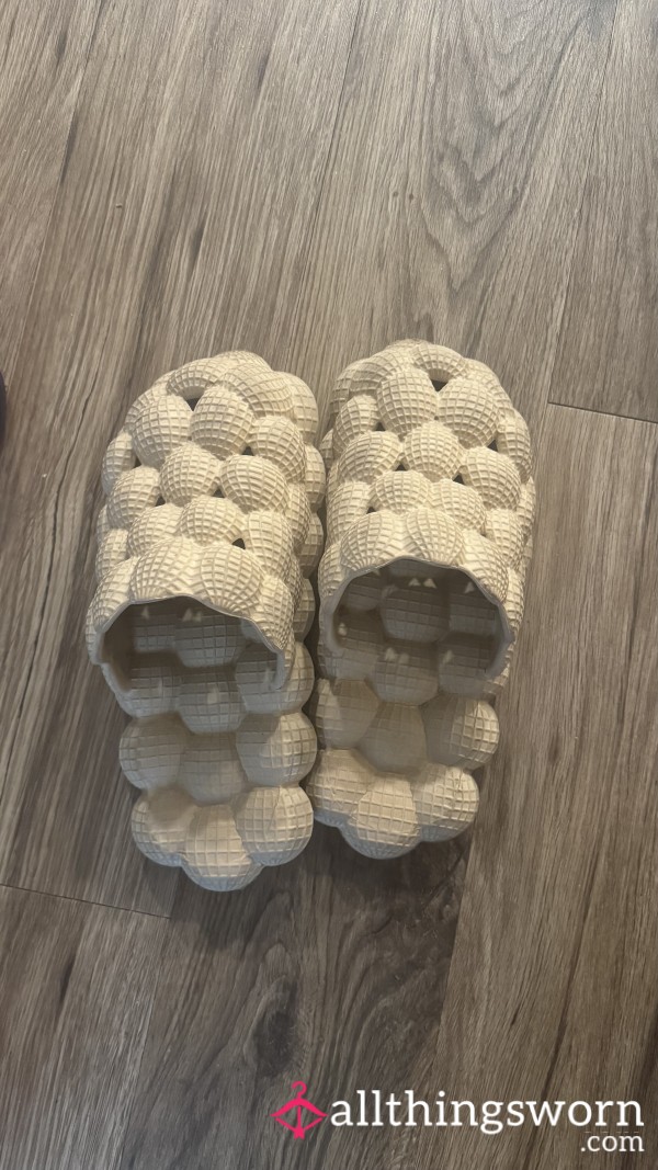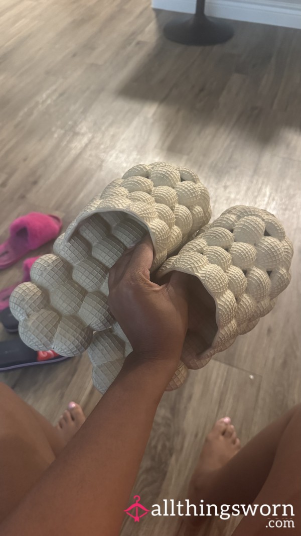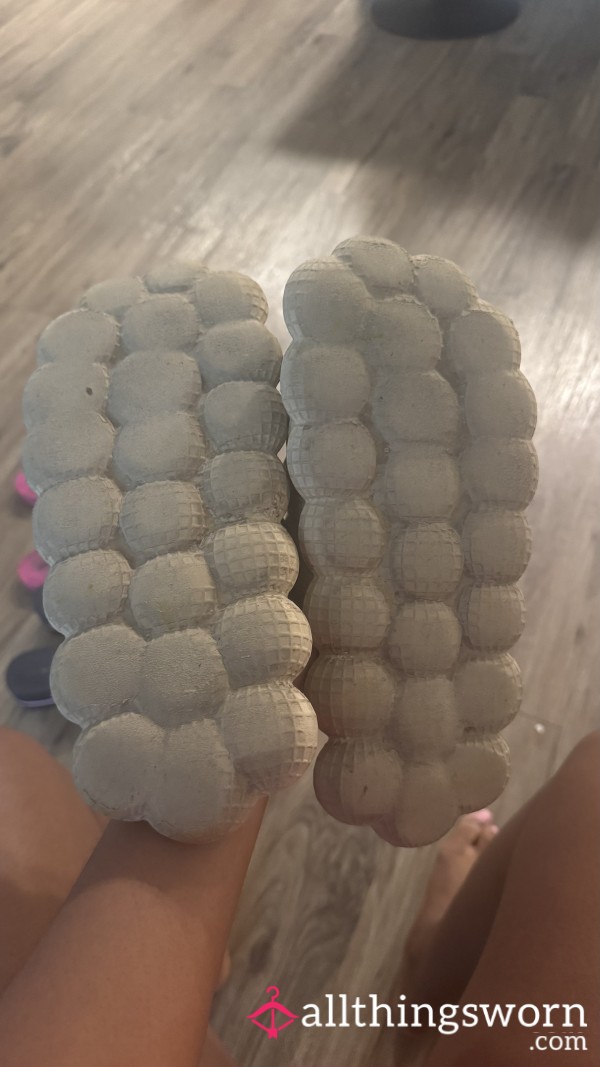 Filthy s**y gold flip flops, very worn and smelly, had for few years now, been on party holidays...