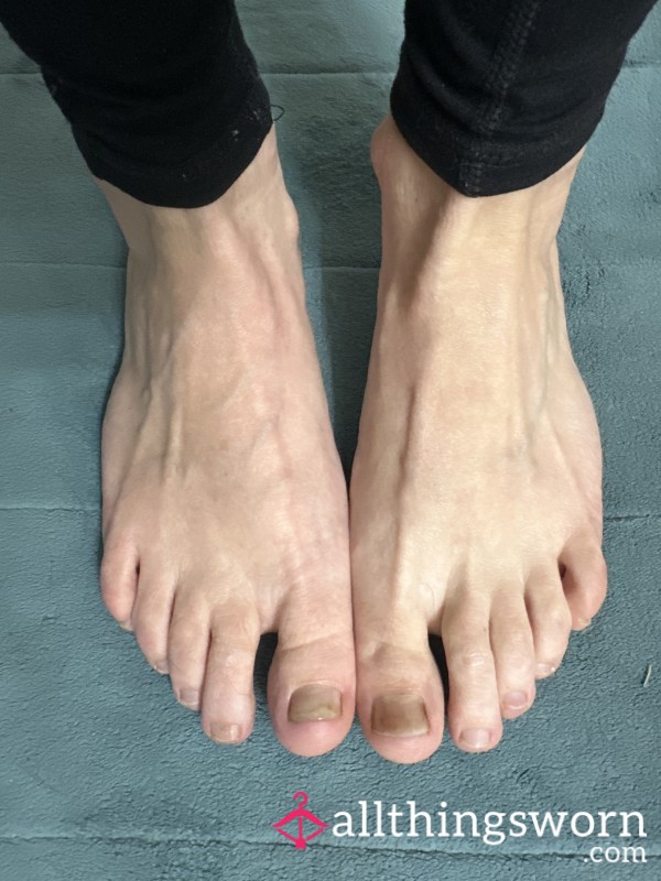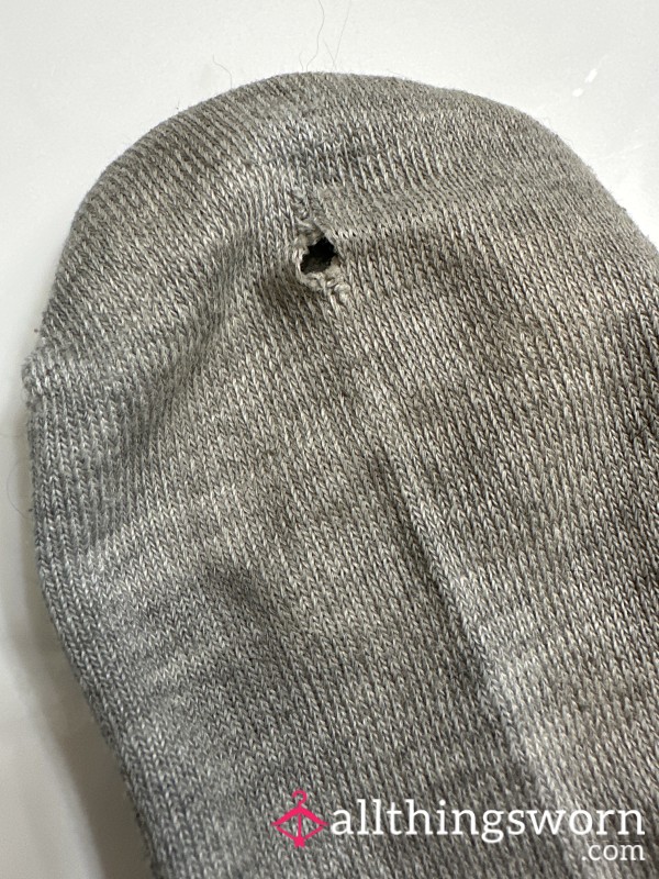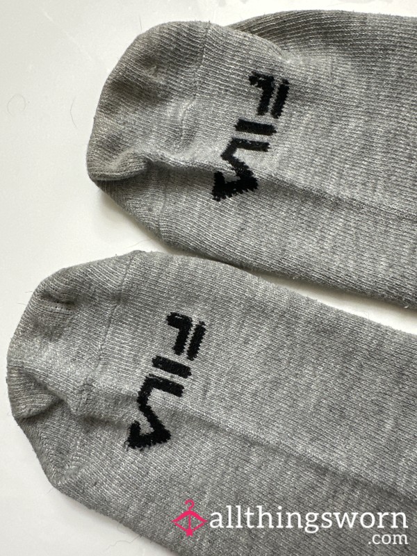 We’ll work gray fila socks, no show ankle style. No holes in the toes, but one has a hole on the bottom side near the toes, and is discolored on the soles. Last worn at the gym for a weight lifting session.