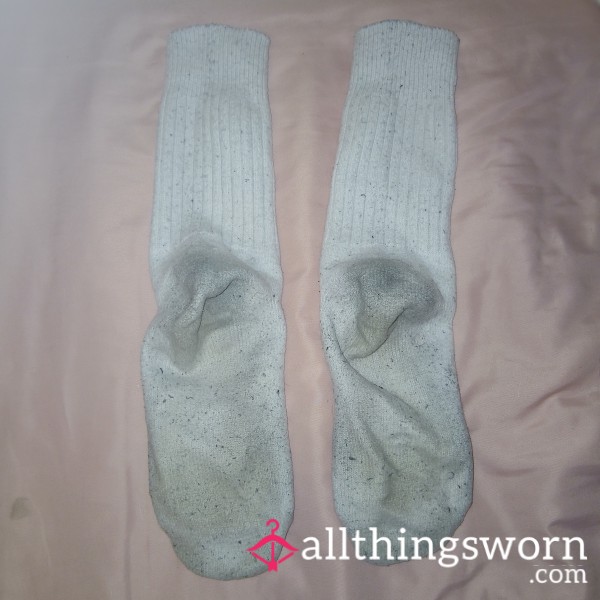 Well worn purple fluffy socks with holes...