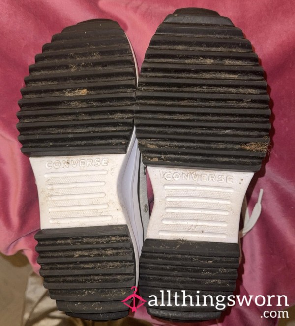 Trashed grey and white trainers. Well worn, stained, smelly and broken sole...