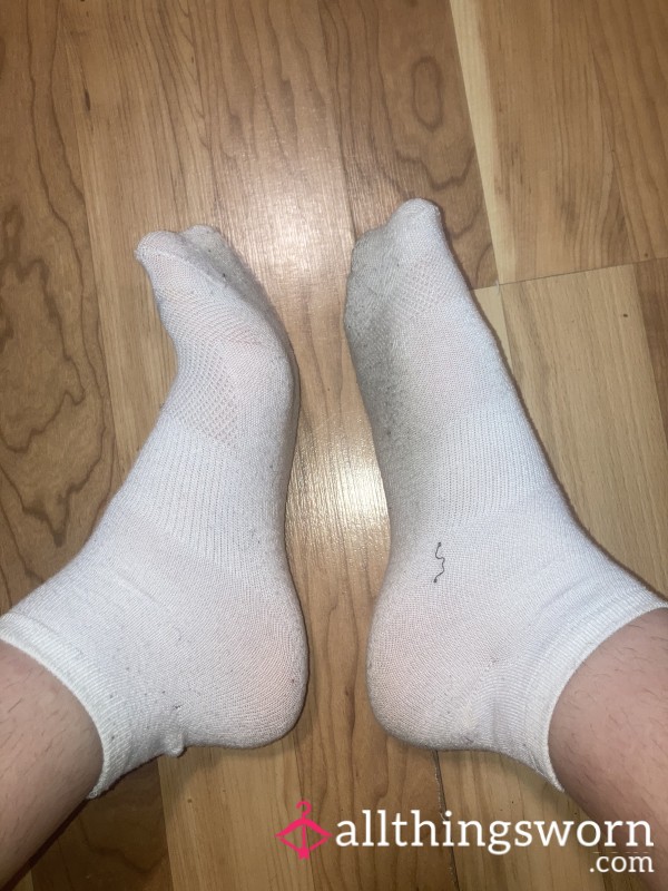 Well worn, white ankle socks, comes with 24hr wear. Fits my size 8.5 foot in them.