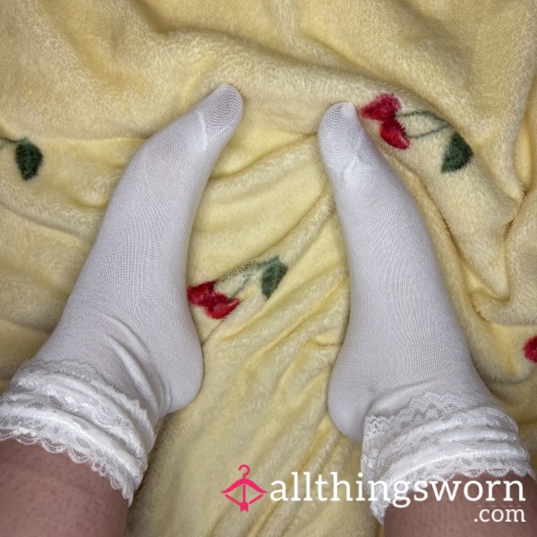 White Lace Frill Socks Lace Frill Socks Crew Socks Worn Socks Naturally Worn All Day Wear Soft Fabric Feminine Socks Warm Socks Scented Socks Sock Fetish Foot Fetish Fetish Socks Soles Stinky Feet Smelly Feet Dirty Socks UK Seller Alternative Tattooed Piercings Gym Girl Soles