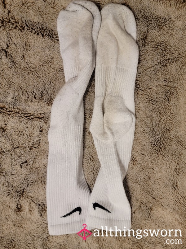 These white Nike crew socks will be worn a full sweaty day for you. tight around my calves, soaked inside my sneakers, and clinging to every curve of my arch.
