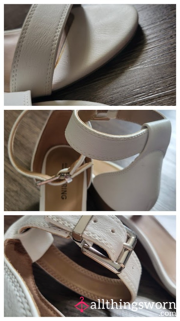 Well worn red p**p toe pumps. Wore to work, out, fetish photo shoots, etc. Definite signs of wear...
