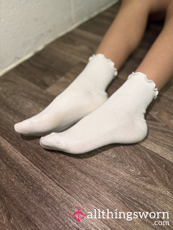Well worn white old dirty socks worn all day and to a very sweaty leg and cardio gym...