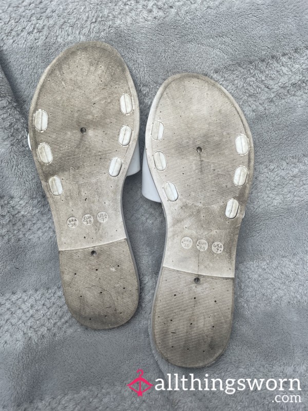 These white sandals have been properly worn and loved. Scuffed soles, creased straps, and that unmistakable look only...