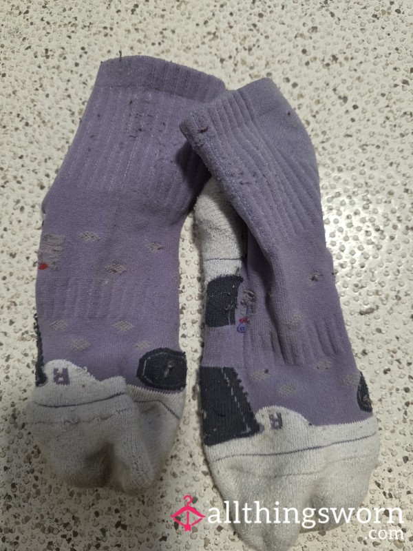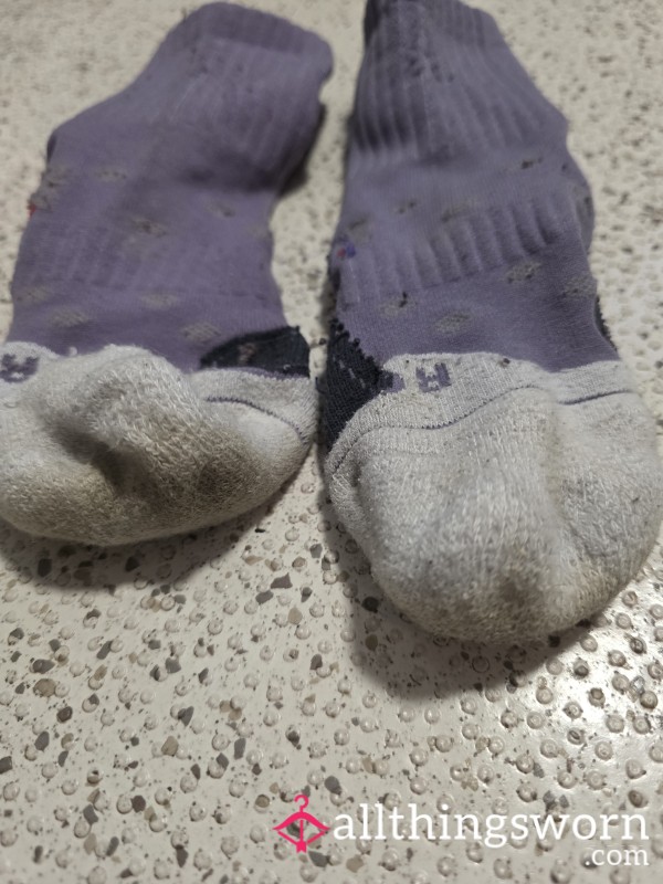 These sheer black nylon socks wrap around my feet and cling like a second skin. The dark stripes...