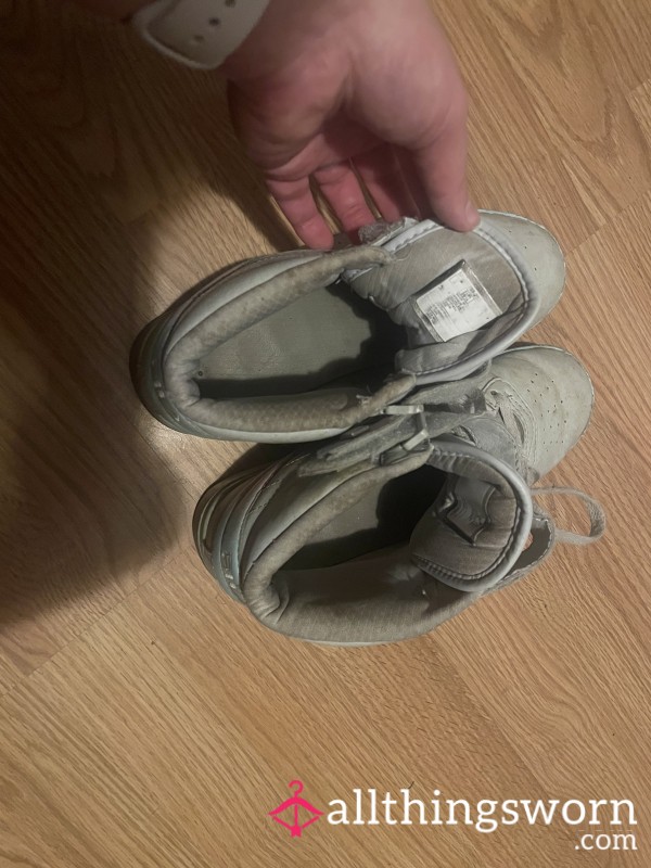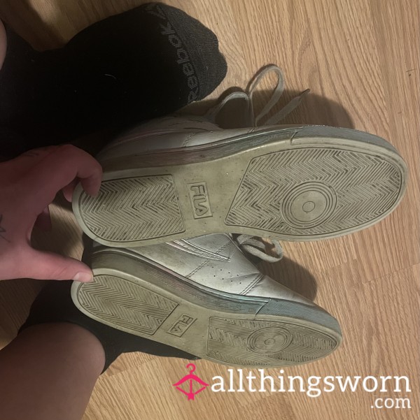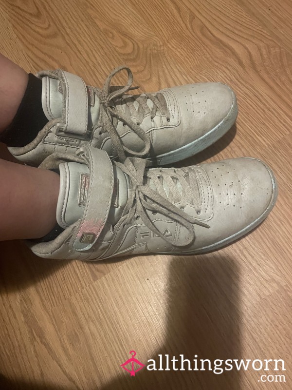 Worn Fila gym shoes. They are extremely dirty and well worn but do not stink. They are a US size 8 1/2. They are greyish blue with pink and blue accents.