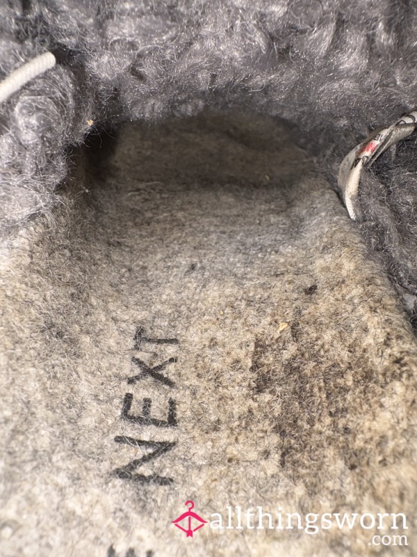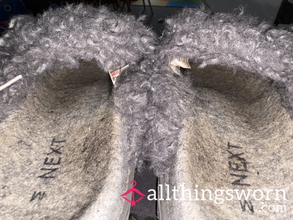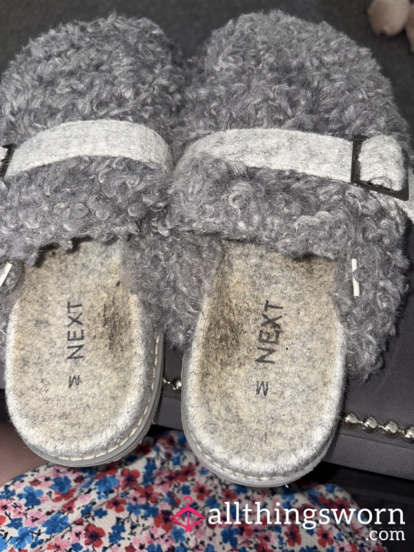 Grey fluffy Primark slippers, every step wrapped in my warmth and molded to my feet...