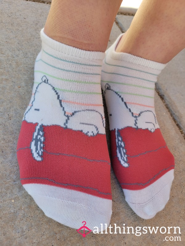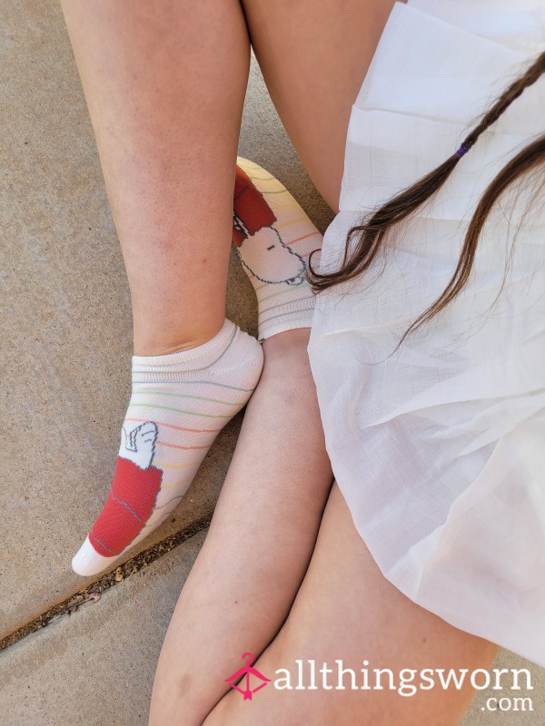 Looking for a pair of socks that say, “I’m cute, but I might cause trouble”? These cream-colored Snoopy socks with rainbow stripes bring sweet childhood nostalgia — with a grown-up twist. Featuring Snoopy doing what he does best: laying flat on that red doghouse like he owns the world (and your attention).