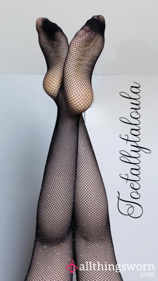Pre-owned fishnet stockings, heavily worn with visible signs of use. Includes small holes caused during intimate wear. Sold...