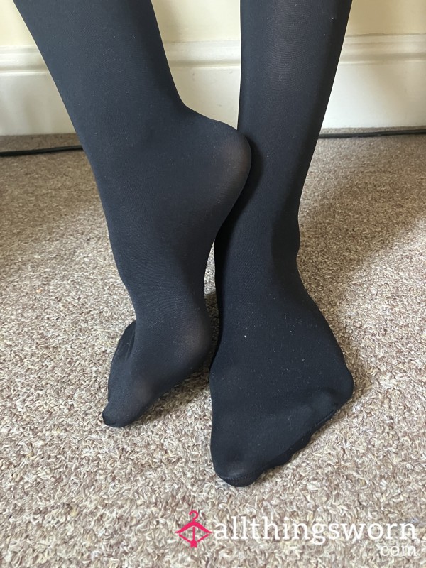 Worked out in these nylons today, doing piliates. Then walked around in the 90° humid weather hanging signs...