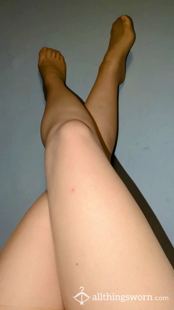 A cla**ic pair of sheer black tights, worn through a full day in the office. They have that...