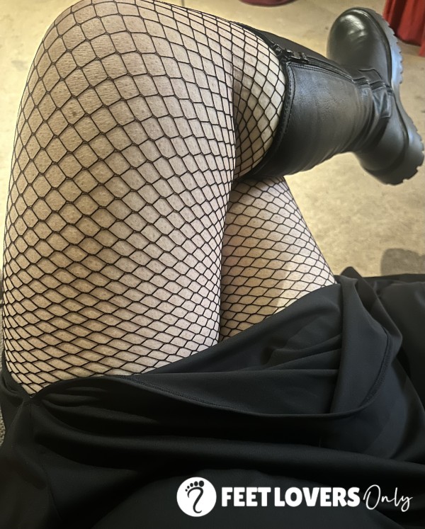 Ive gone pantieless in my black fishnet tights today. In this sunshine too. Creamy and sticky in the crotch and fragrant on the feet from wearing in boots. Who wants them? Get in touch to discuss